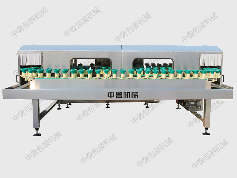 本机采用套筒滚子链传动原理,整条输送链传动,水采用跟踪喷冲和固定管道喷冲, 清水部分则采用水分配阀跟踪喷冲,以节约水源,水的利用率。